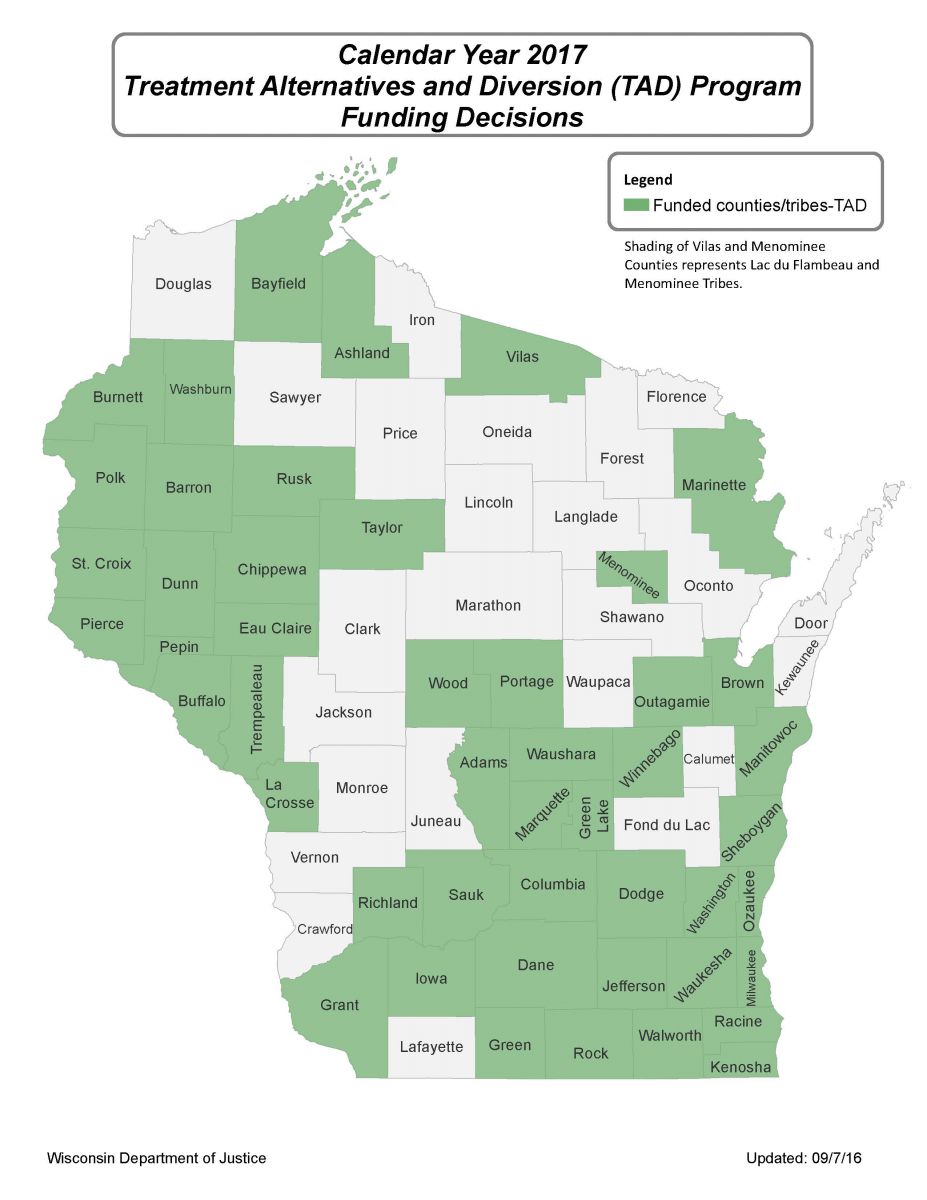 In September, as required under the state statute, the Wisconsin Department of Justice announced the recipients of Treatment Alternatives and Diversion (TAD) funding as a result of the calendar year 2017 competitive grant process. The awards for calendar year 2017 represent the beginning of a new five-year funding cycle.